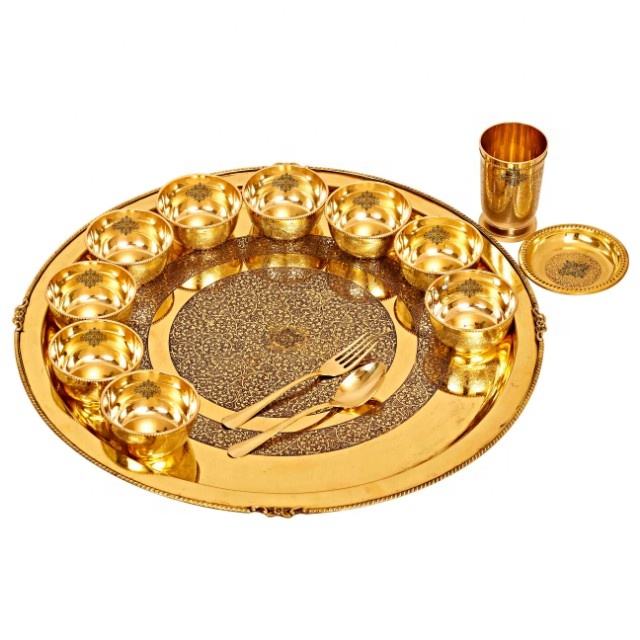 Juego de cena Thali de latón personalizado, 14 piezas, 1 plato pequeño, 1 vaso, 1 cuchara, 1 tenedor y 9 cuencos, precio al por mayor