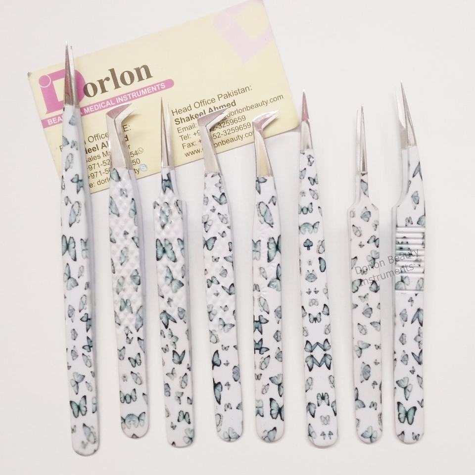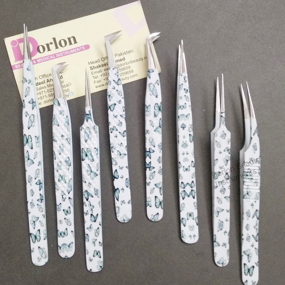 Juego de pinzas de extensión de pestañas recubiertas de papel con estampado de mariposa personalizado, pinzas personalizadas de acero inoxidable para extensión de pestañas