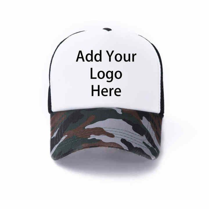 Gorra de malla de béisbol de 5 paneles de espuma con logotipo de camuflaje personalizado, gorra de camionero, poliéster/algodón