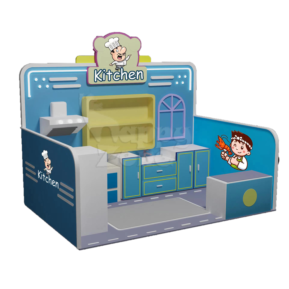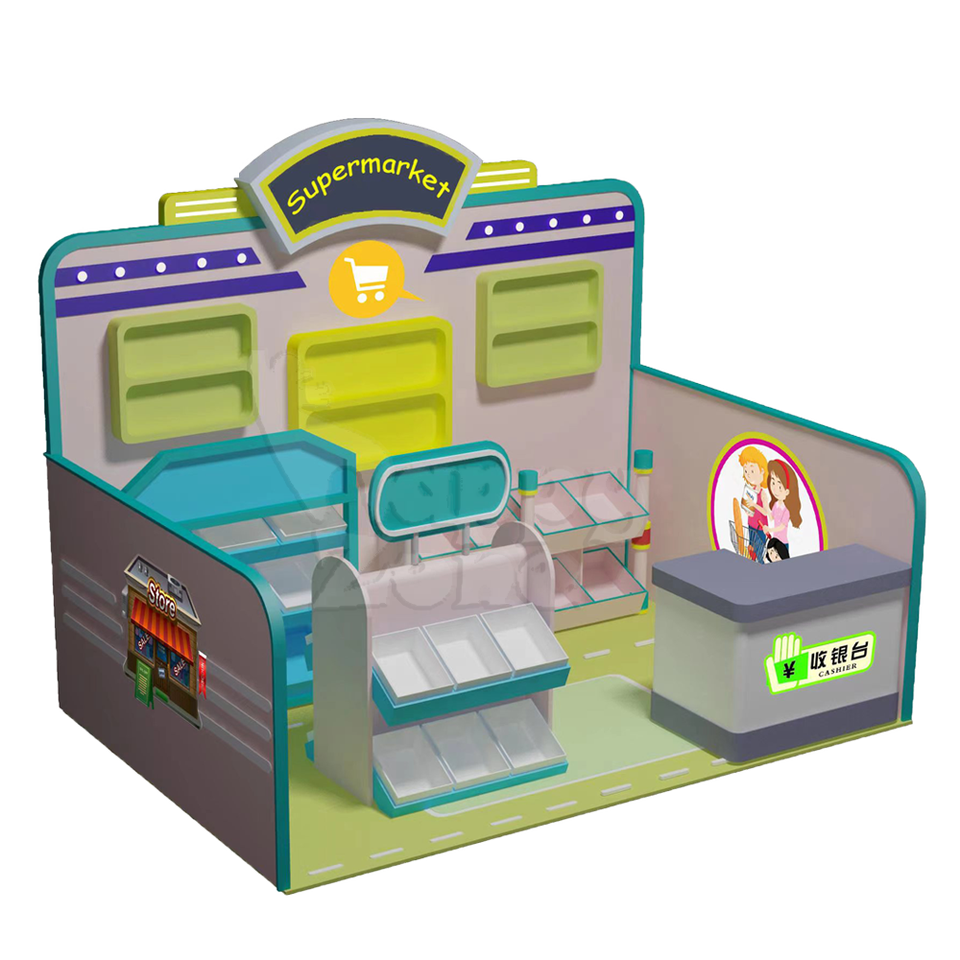Mini patio de recreo interior personalizado colorido, estación de ciudad interior de plástico, cocina para juego de simulación, papel de supermercado
