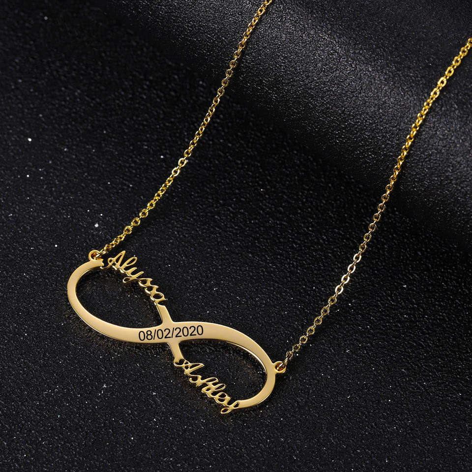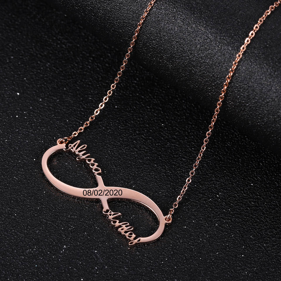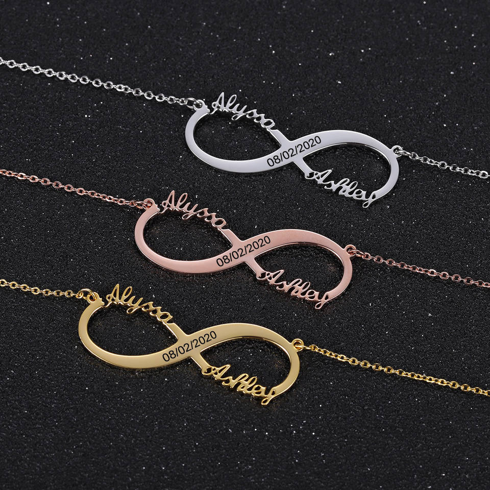 Parejas personalizadas enviar novia y novio tallado infinito letras colgante personalizado infinito collar de dos nombres