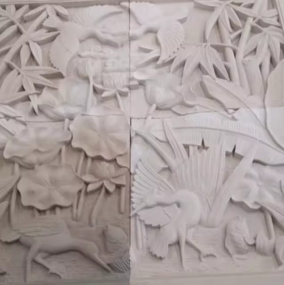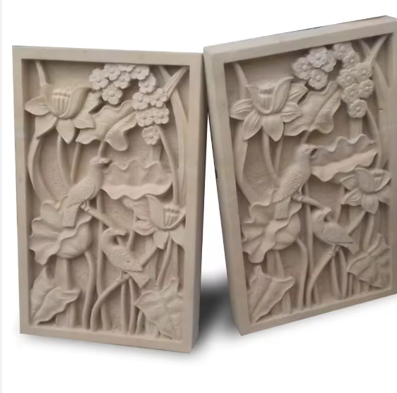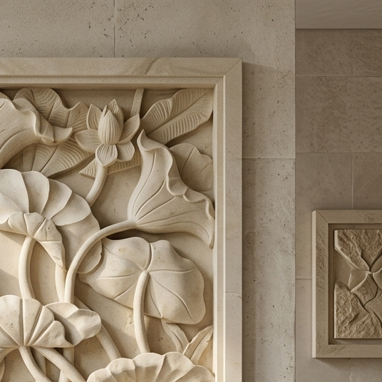 Escultura de Relieve de Piedra Bali Beige de Diseño Personalizado, Piedra Caliza Natural 100% Tallada a Mano, Patrón Floral 3D, Arte Mural Moderno para Villa