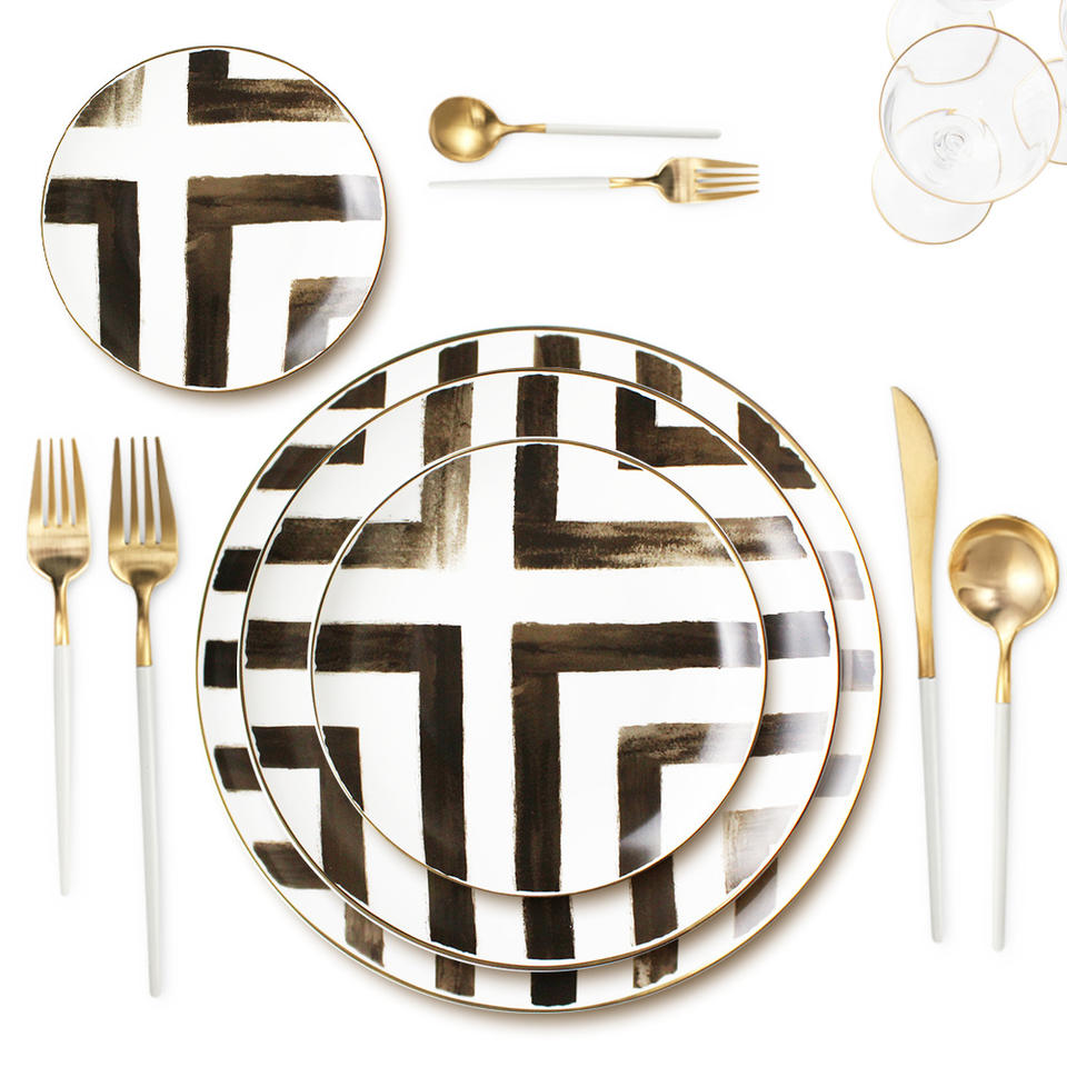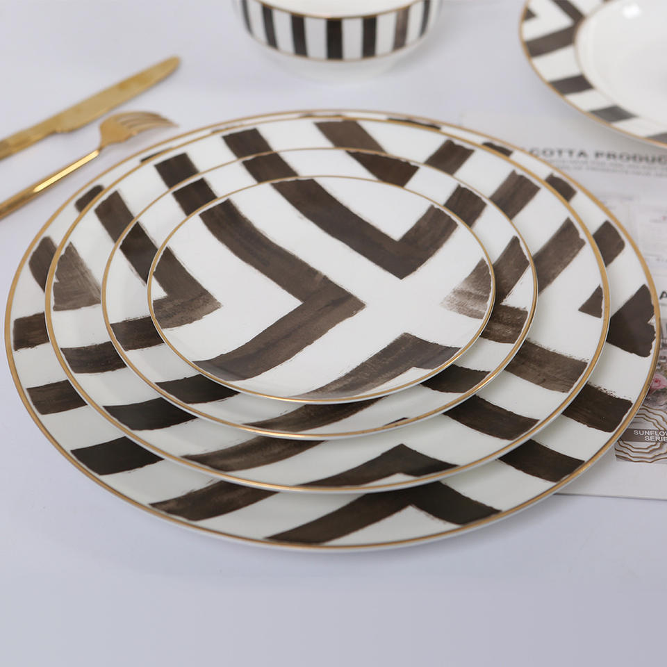 Juego de vajilla de porcelana con diseño personalizado, juego completo de vajilla de cerámica a rayas con diseño completo de hueso