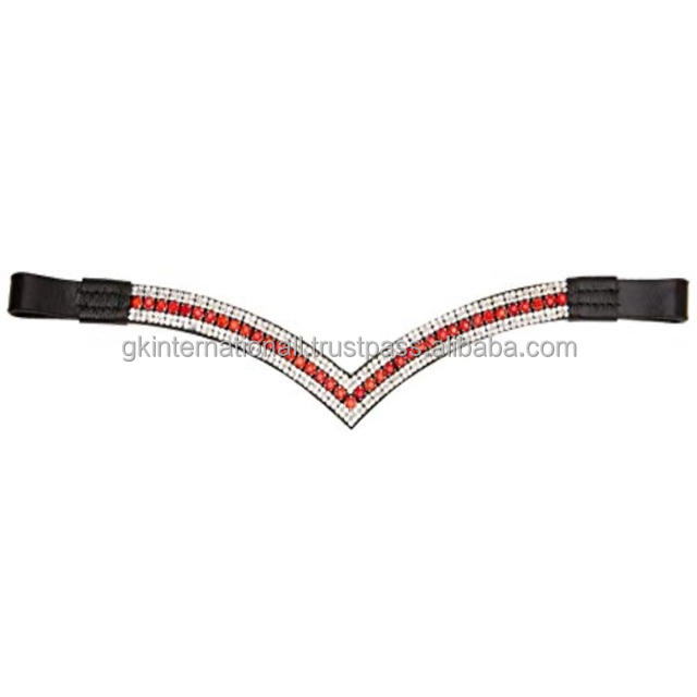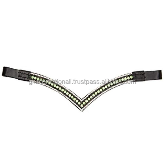Diadema para Caballo de Cuero Genuino Negro Decorativa con Cristales y Piedras de Estrás en Forma de V Profunda, Diseño Personalizado, en Tallas Completa y Cob