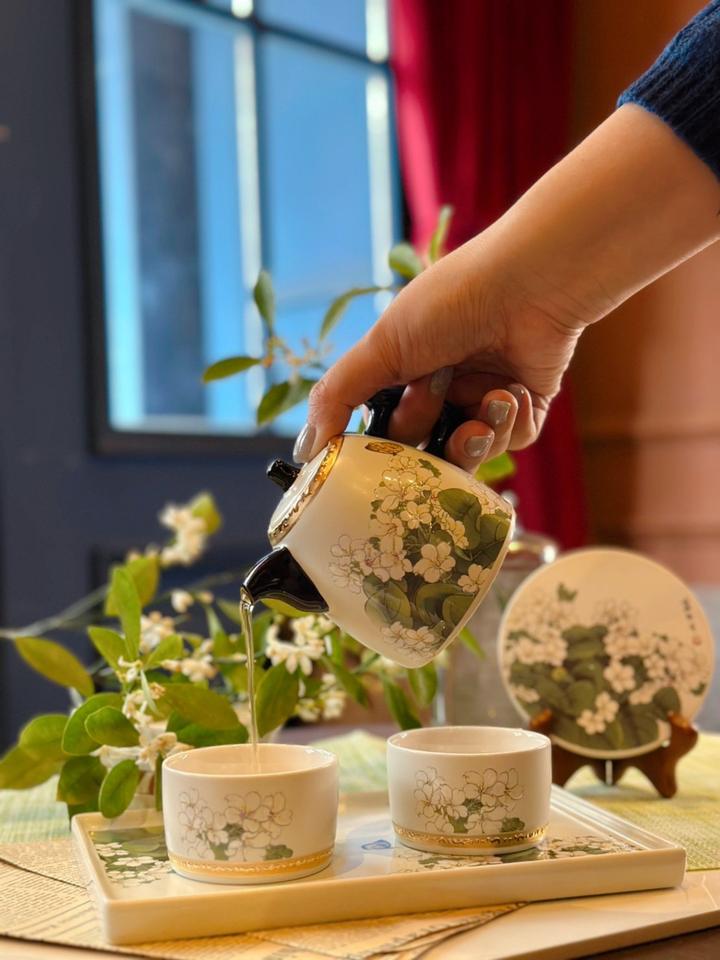 Diseños personalizados Impresión de pantalla Transferencia Cerámica Casa Porcelana Tetera Onglaze Calcomanía Tung Blossom Jinglan Juego de tazas de té