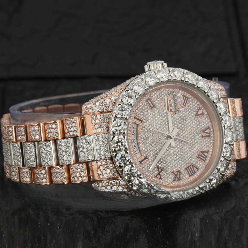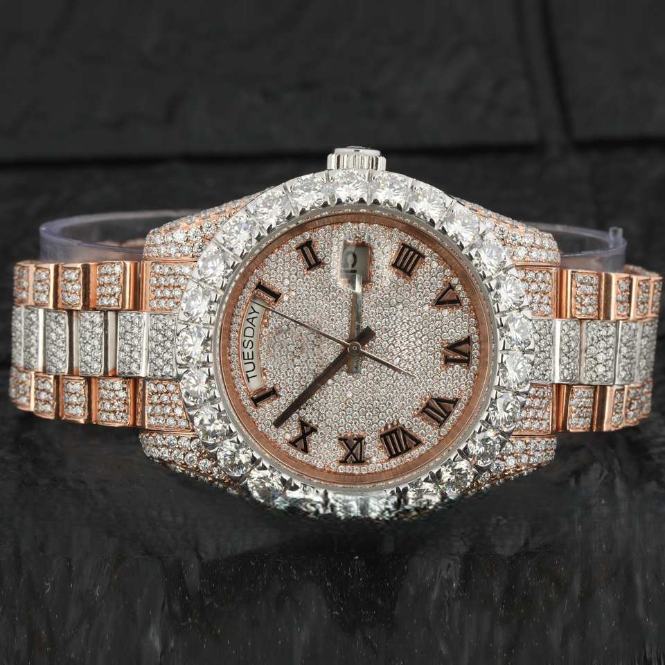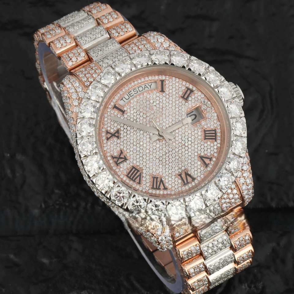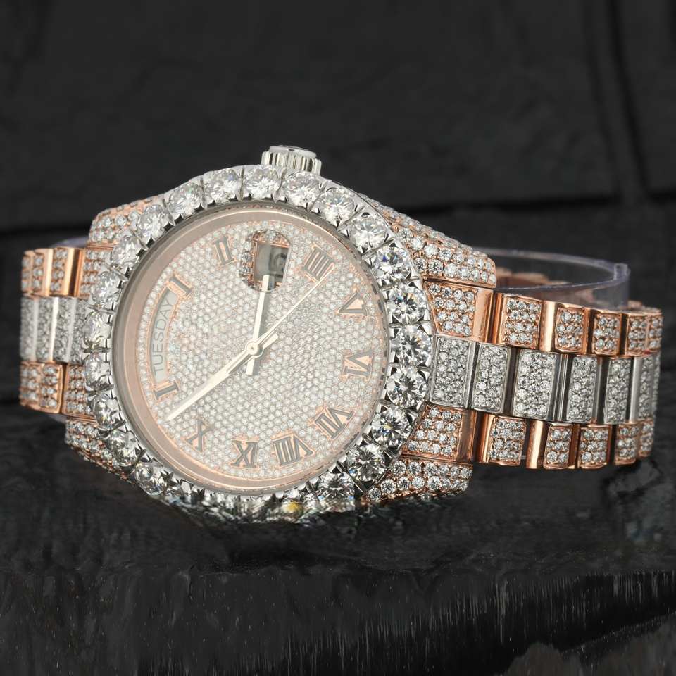 Moissanite de acero inoxidable personalizado de doble tono, diamante, número Romano helado para la función de negocios, deporte, moda, cristal de cuarzo
