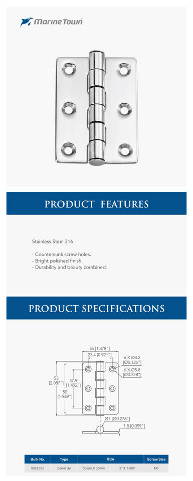 Bisagra personalizada de acero inoxidable de calidad duradera 316 Hardware marino Barrel Up Stamping
