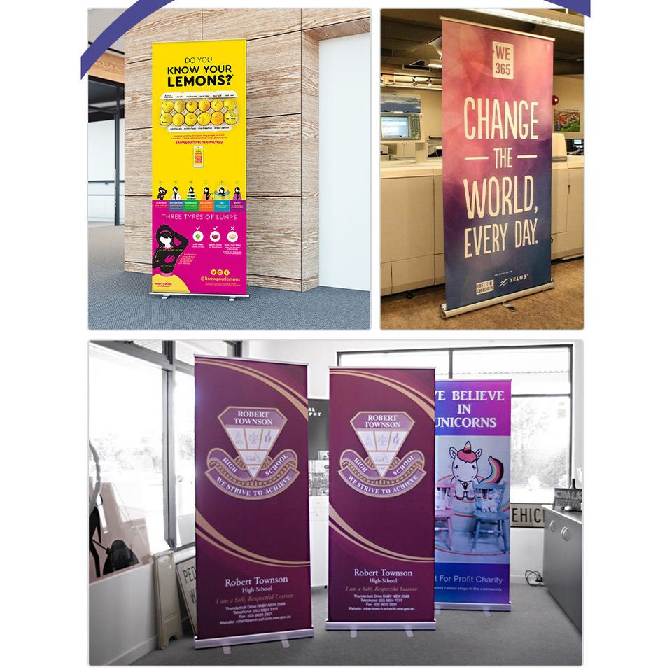 Banner de desplazamiento interior ecológico personalizado, banner de desplazamiento de una y doble cara, soporte de banner de desplazamiento retráctil de aluminio