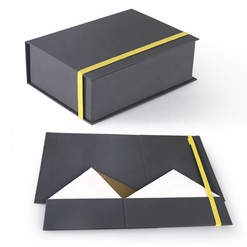 Caja de zapatos plegable gris personalizada de paquete plano con cordón elástico amarillo Ventaja UV Diseño en relieve Regalos de embalaje impresos