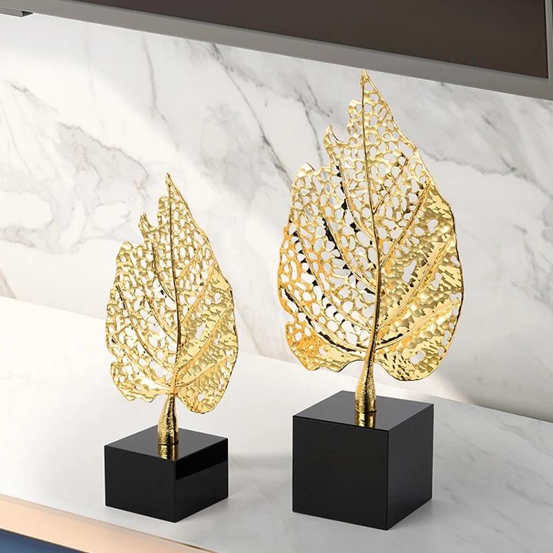 Estatuilla Gingko abstracta de hoja dorada personalizada, escultura de escritorio de madera, estatua, artesanías de Metal, objetos decorativos para el hogar