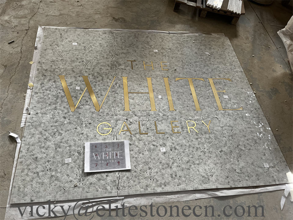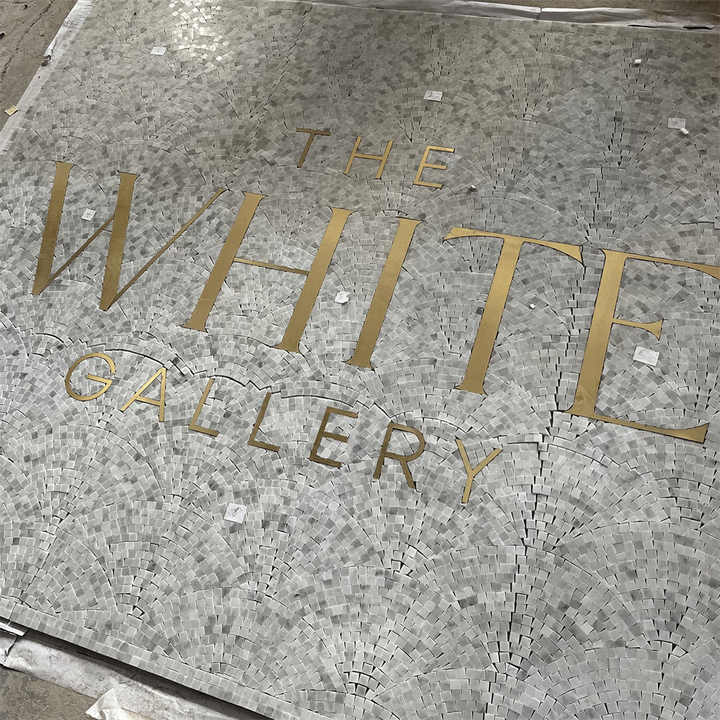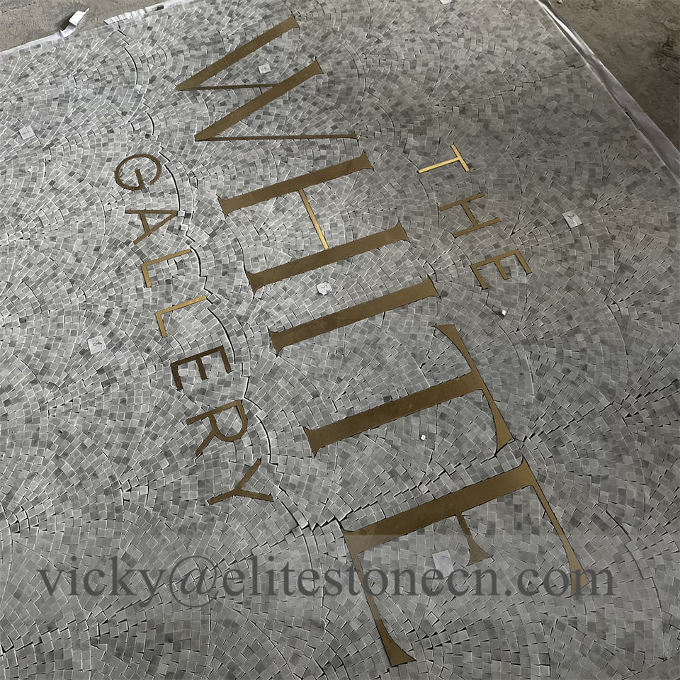 Nombre de la Piedra:Mosaico de chorro de agua, medallón mural, letras de latón dorado, logotipo