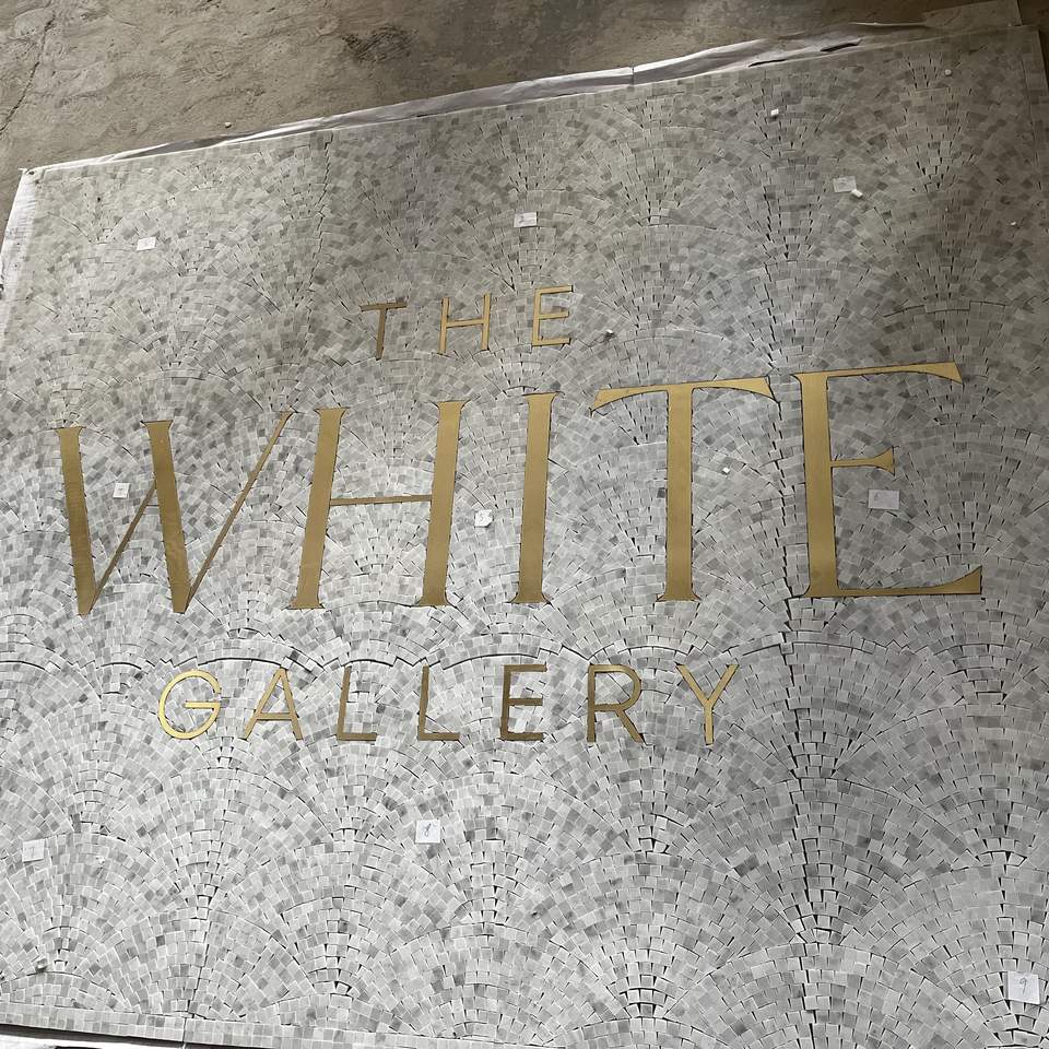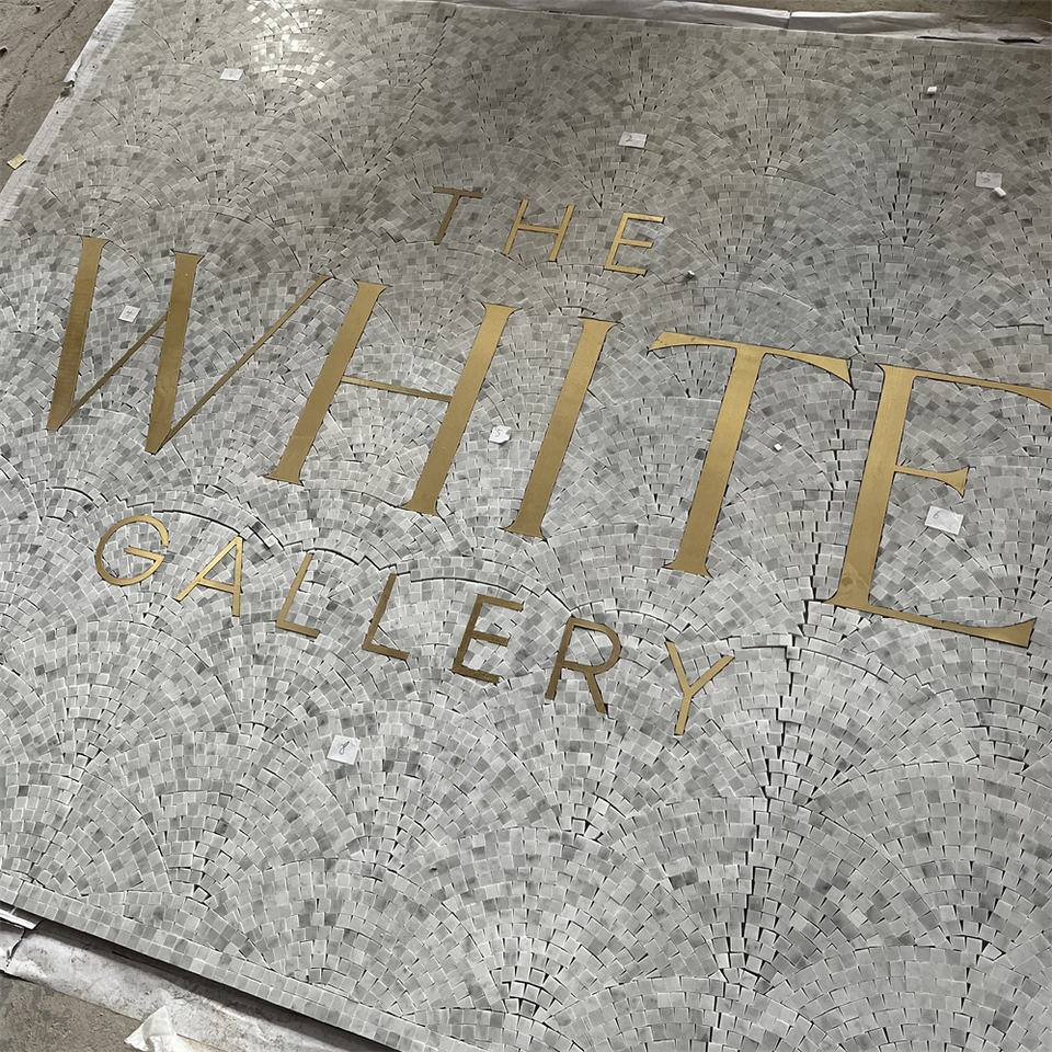 Mosaico de chorro de agua, medallón mural, letras de latón dorado, logotipo