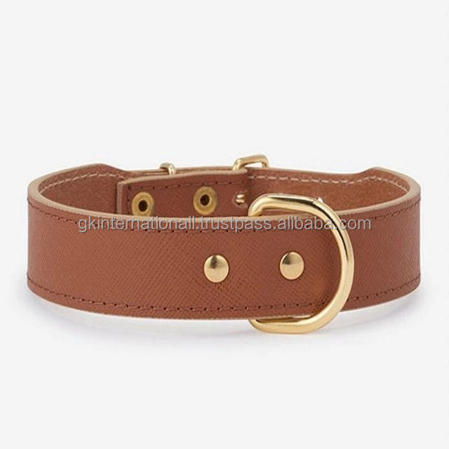 Collar de cuero para perro hecho a mano, personalizado, de piel de vaca bronceada y negra, con hebilla chapada en oro, anillo D y remaches