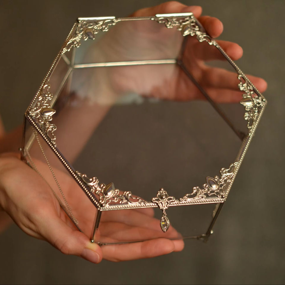 Joyero de cristal de forma hexagonal personalizado con marco de metal acabado perfecto para almacenar anillos collares y accesorios finos