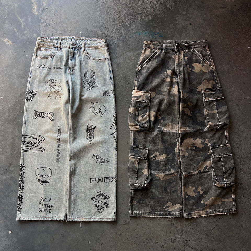 Decoración:Pintado, Llamaradas bordadas, Costura lateral, Rayado, Parches, Apliques, 3D bolsillo, Botón, Patrón