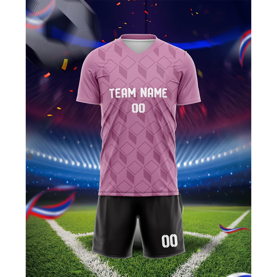 Camiseta de fútbol con patrón geométrico y cuello en V de alta calidad personalizada, camisetas de corte automatizado de poliéster Rosa 100% para jugadores de fútbol
