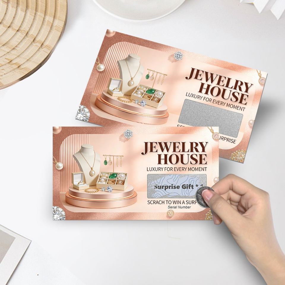 Tarjetas Rasca y Gana Promocionales de Cartón Impresas a 4 Colores, Personalizadas y de Alta Calidad para Joyerías y Tiendas de Regalos