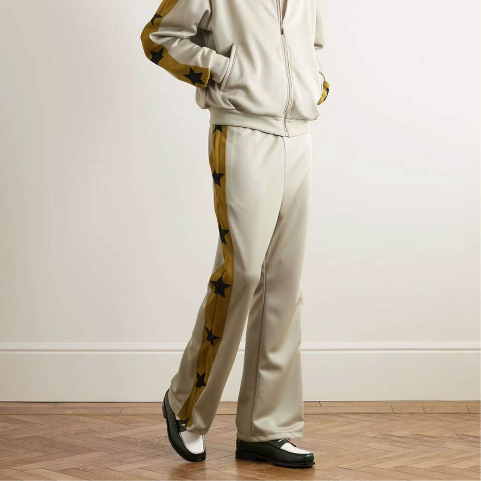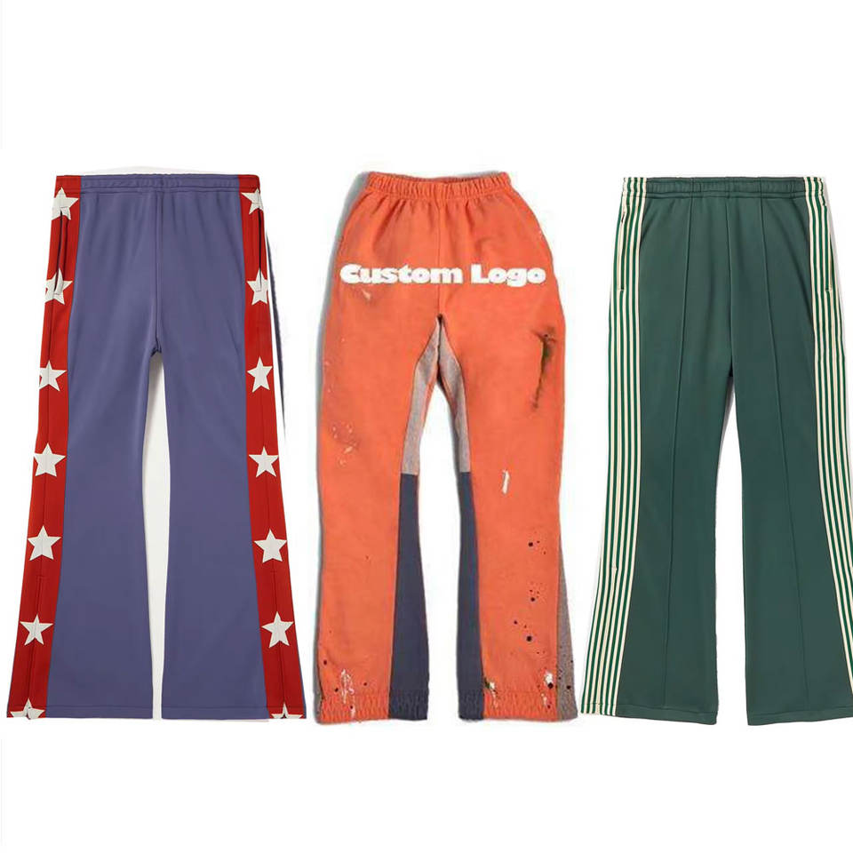 Nuevos pantalones de chándal acampanados personalizados de alta calidad para hombre, pantalones de chándal apilados informales con estampado de grafiti personalizado con parche multicolor