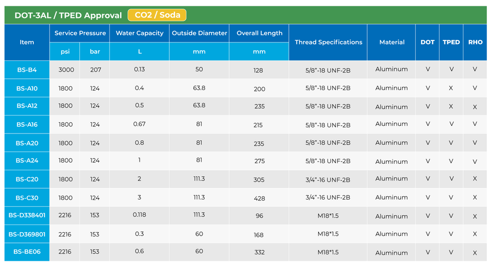 Tanque de CO2 de 2000ml con certificado ISO personalizado, cilindro de aluminio de 1800 PSI para aplicaciones industriales