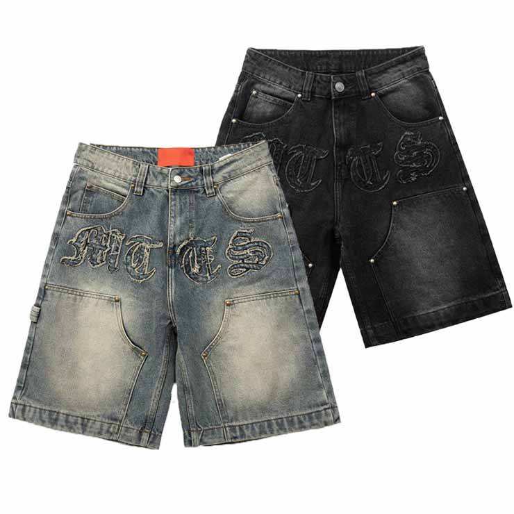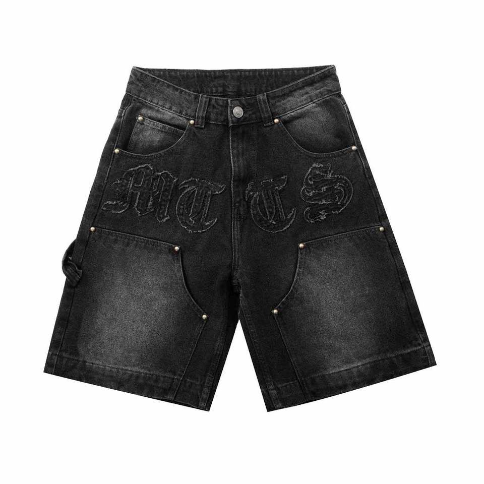 Pantalones Cortos de Mezclilla Azul Lavado con Parches Bordados y Logotipo Personalizado, Bolsillos Dobles en la Rodilla, Estilo Cargo, Streetwear