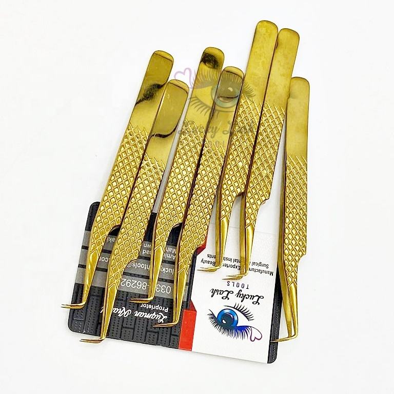 Pinzas de 90 grados de plasma dorado con punta de polvo de diamante con etiqueta personalizada, pinzas para extensión de pestañas, volumen sostenible, acero inoxidable