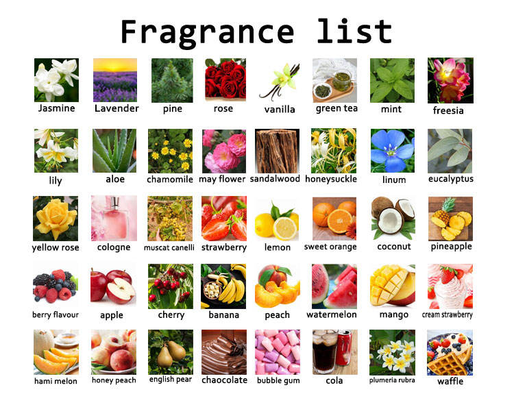 Vainilla, Coche nuevo, Limón, Fresa, Piña, Jazmín, Menta, etc.