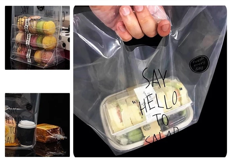 Bolsa para llevar con mango de plástico troquelado con logotipo personalizado para uso en panadería, ensalada, chicle, Sushi, leche, comida enlatada