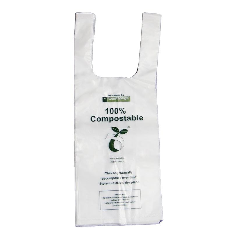 Bolsa de camiseta con refuerzo lateral de PLA respetuoso con el medio ambiente con logotipo personalizado HDPE/LDPE portador degradable compostable para llevar pasteles para beber calor