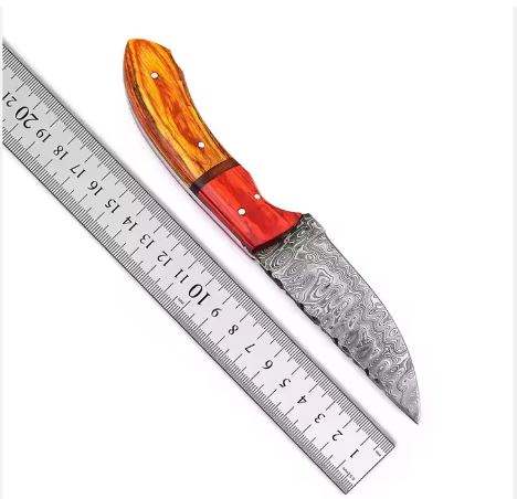 Cuchillo de acero damasco forjado a mano Tang completo con logotipo personalizado, hoja fija, mango de madera, caza Industrial, uso de cuero, soporte OEM