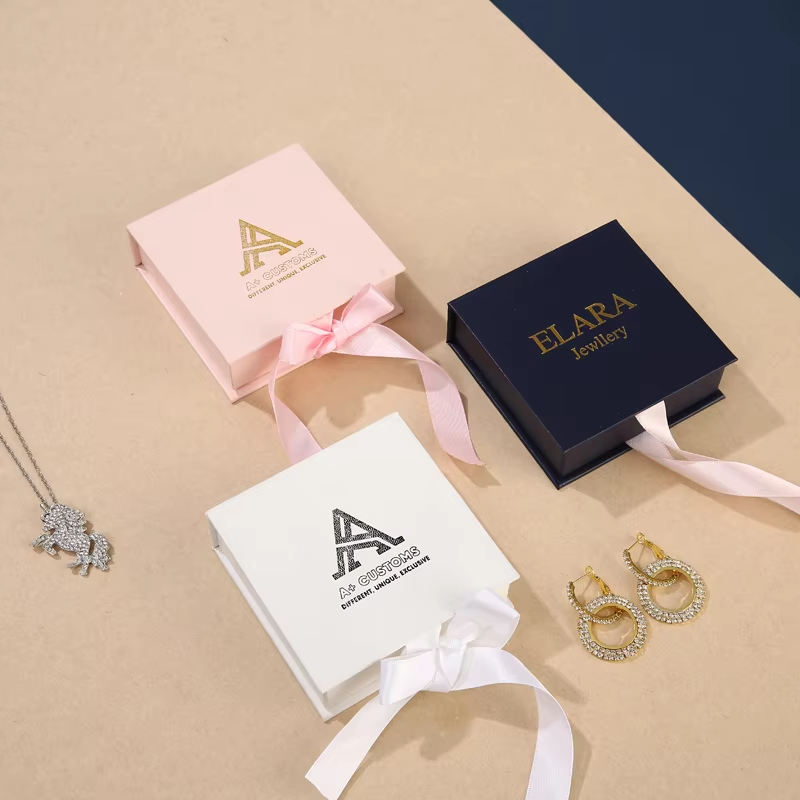 Caja de Joyería Rectangular con Lazo, Personalizable con Logotipo, para Pendientes, Collares y Accesorios, Ecológica y Moderna