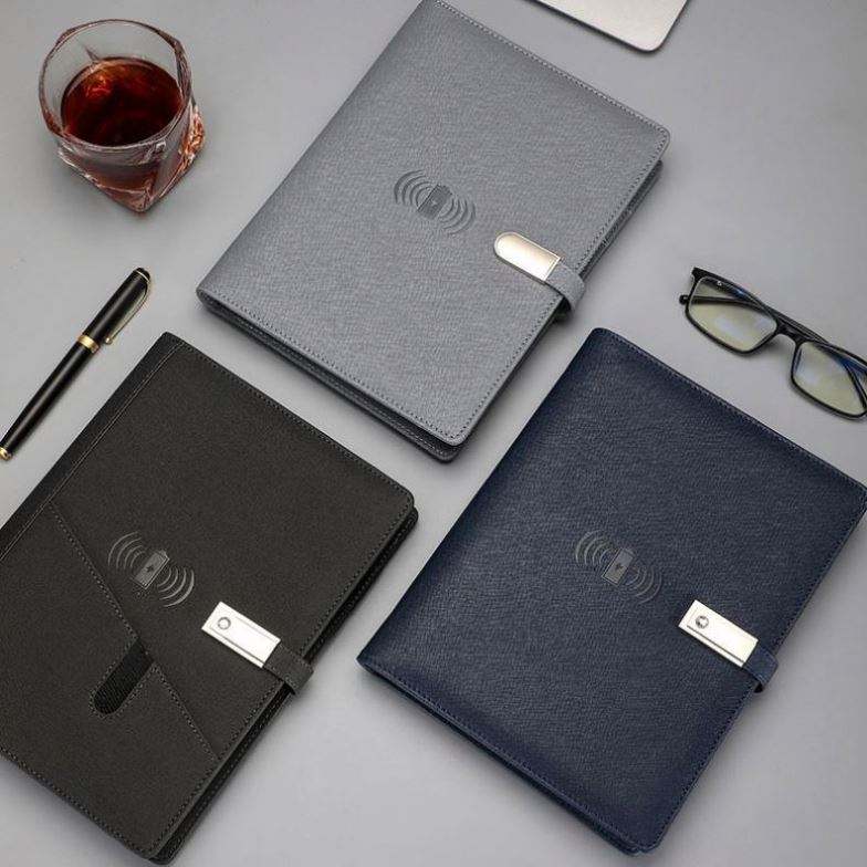 Bloc de notas inteligente de carga inalámbrica A5 multifuncional con logotipo personalizado, Juego de Cuaderno de diario de cuero PU con USB