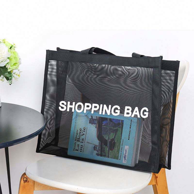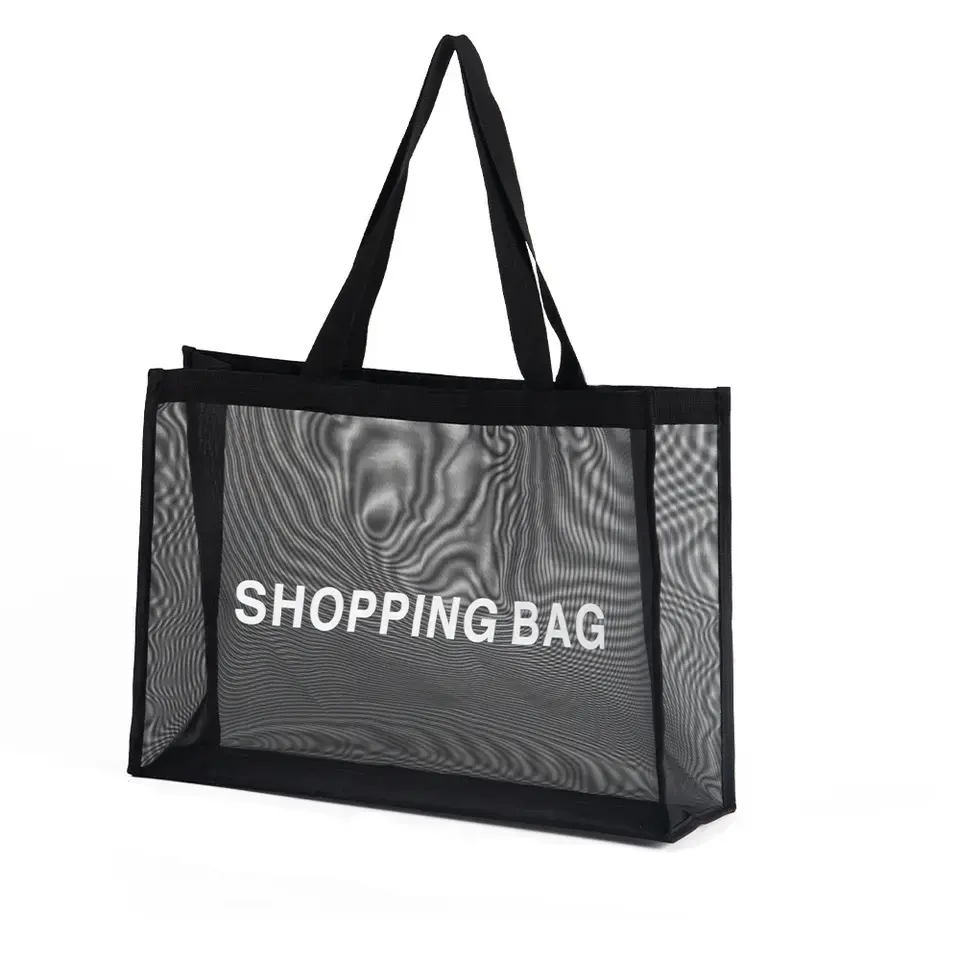 Bolsa de Compras de Malla Transparente Negra Personalizada con Logotipo, Bolsa de Almacenamiento para Playa y Viajes