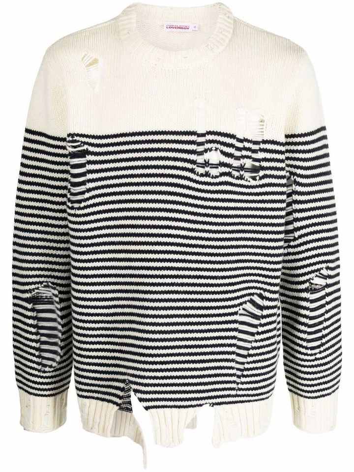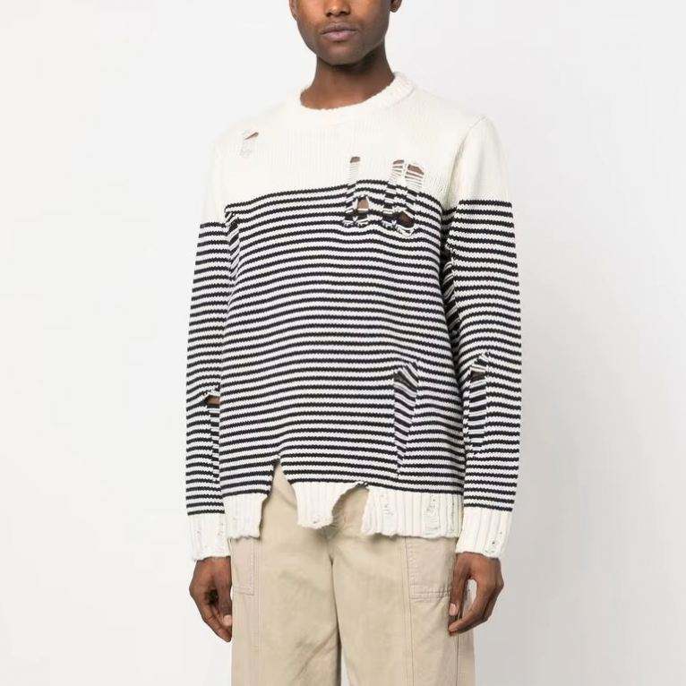 Suéter de punto suelto a rayas personalizado con cuello redondo y suéter de hombre desgastado retro de manga larga