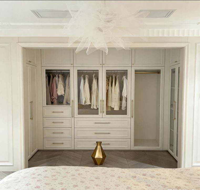 Juego de Armario de Dormitorio de Lujo Personalizado, Armario Empotrado de Madera Maciza con Áreas para Colgar, Zapateros, Cajoneras y Organizadores de Corbatas