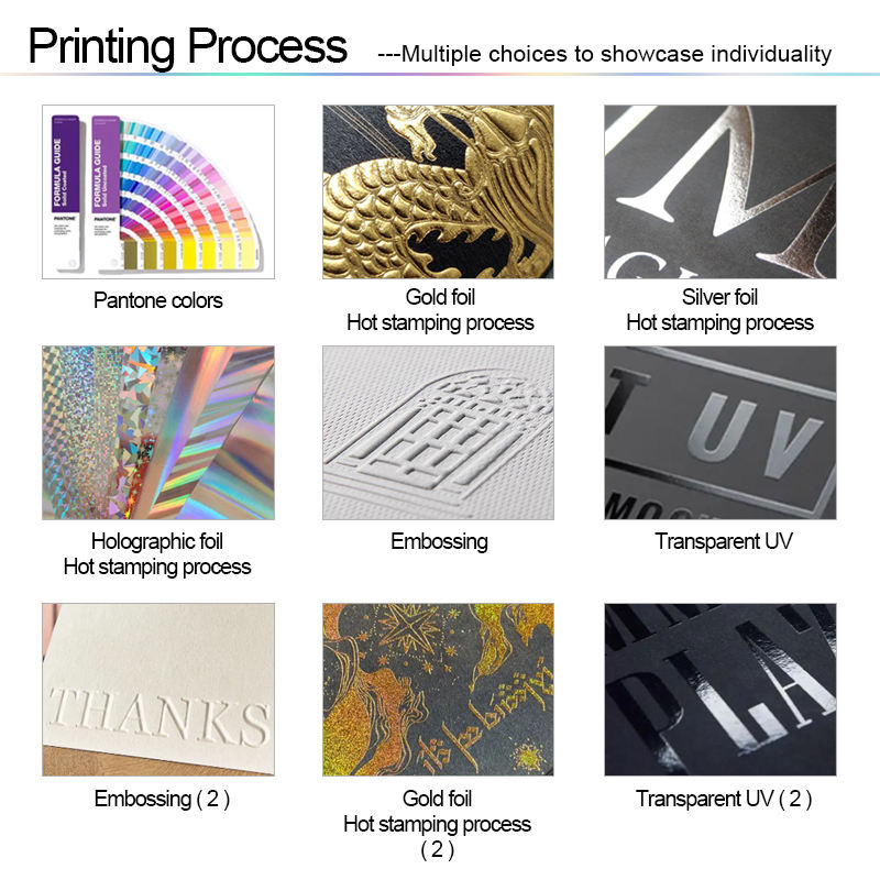 Manejo de la impresión:Impresión de huecograbado, Texturizado, GLİTTER, Corte por láser, Bronceado, Impresión ultravioleta, Hoja de plata, Laminación mate, Barnizado, Estampado, Relieve, Laminación brillante, Revestimiento UV, Desaparición, Lámina de oro, impresión offset, Gofrado/Debossing, Impresión flexográfica, IMPRESIÓN DE PANTALLA DE SEDA, Membranae tectoria, Troqueles, Laminado, Estampado en frío, Estampado holográfico