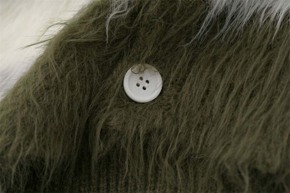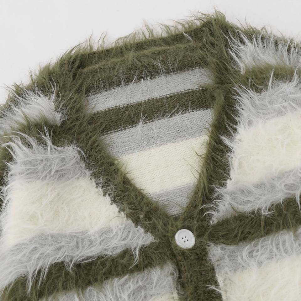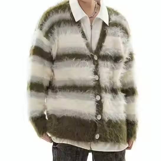 Cárdigan de punto a rayas con botones y cuello en V personalizado para hombre, cárdigan peludo de invierno, suéter de Mohair para hombre