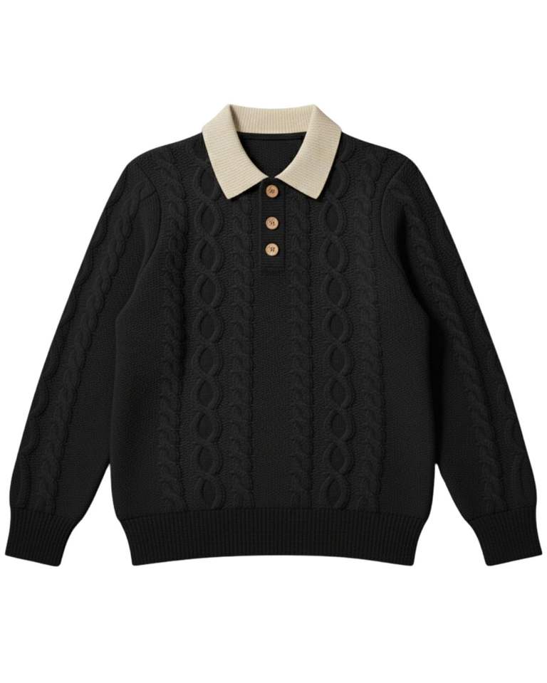 Suéter Polo de Punto Trenzado Personalizado para Hombre, Manga Larga, Cuello con Botones, Cuello en Contraste, Jersey de Invierno en Negro para Venta al por Mayor