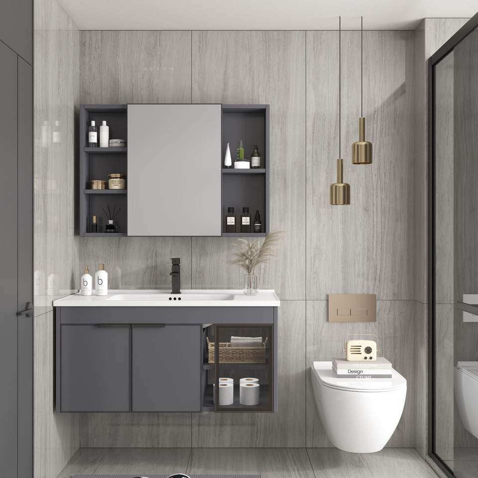 Mueble de Baño Moderno Personalizado de Aluminio Gris Resistente al Agua con Espejo LED, Lavabo de Cerámica y Gabinete de Pared para Villas