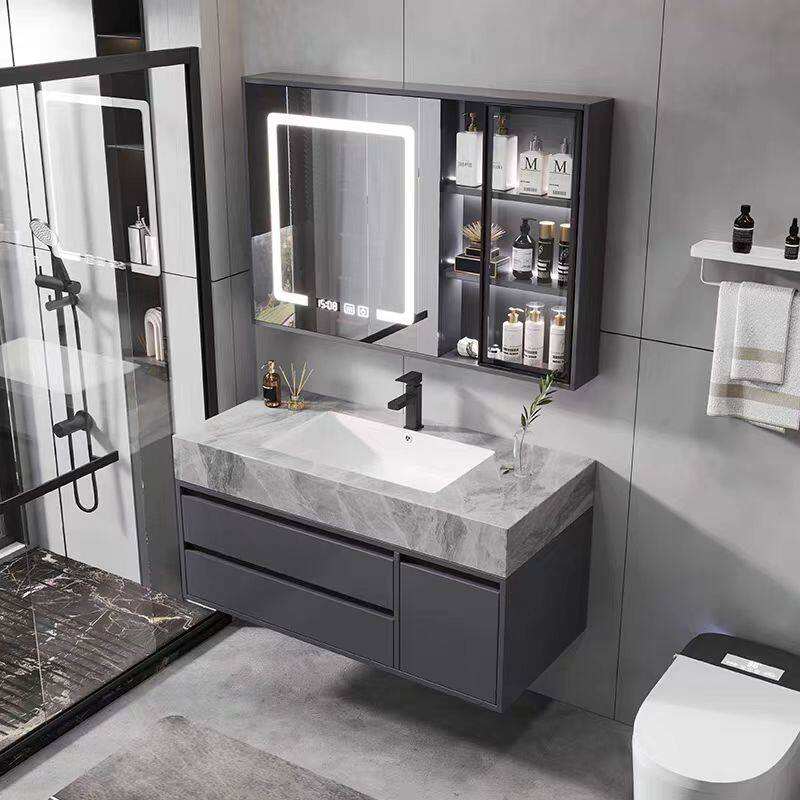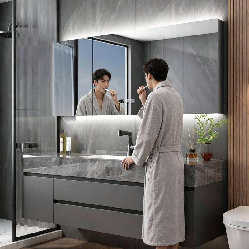 Mueble de Baño Moderno Minimalista Personalizado con Lavabo Cerámico, Montado en Pared, de MDF, con Iluminación Inteligente Antivaho para Hospital