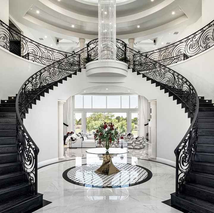 Escaleras curvas con estructura metálica interior de villa moderna personalizada hechas en EE. UU. con acero inoxidable y mármol de hierro forjado/peldaños de madera