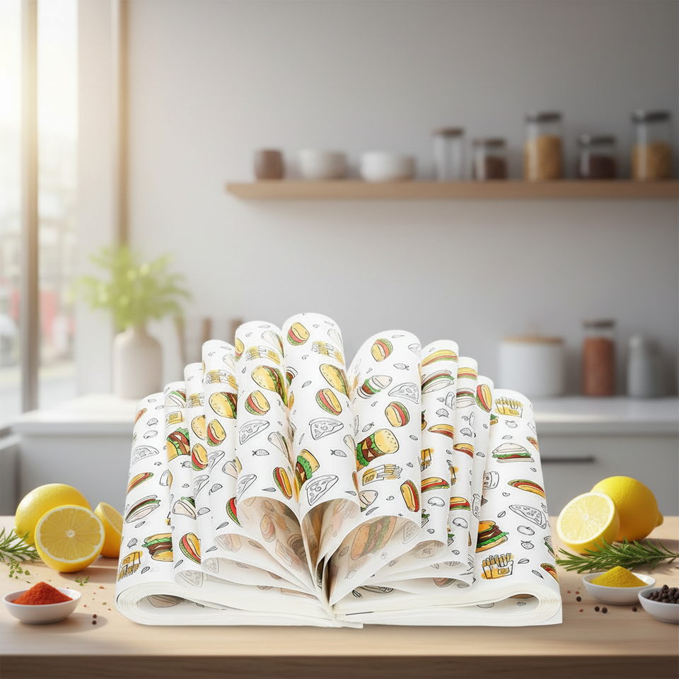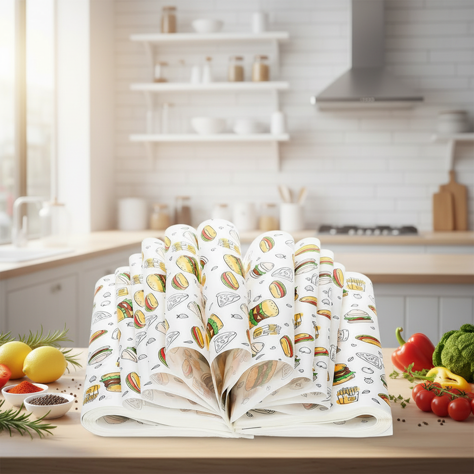 Papel de pergamino personalizado con logo impreso para envolver hamburguesas y sándwiches, papel a prueba de aceite para hot dogs, papel para mantel individual a prueba de aceite.