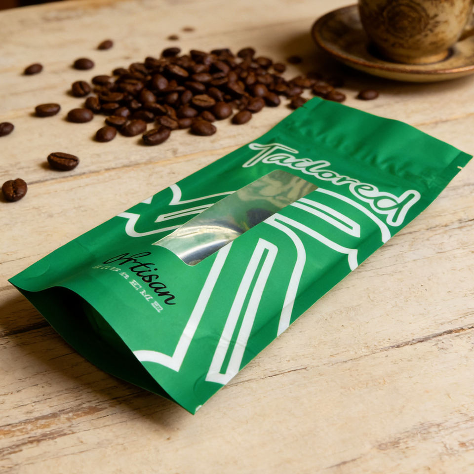 Bolsa de Fondo Plano Personalizada con Impresión, Reutilizable, Laminada, Impermeable, para Empaque de Café y Té con Ventana