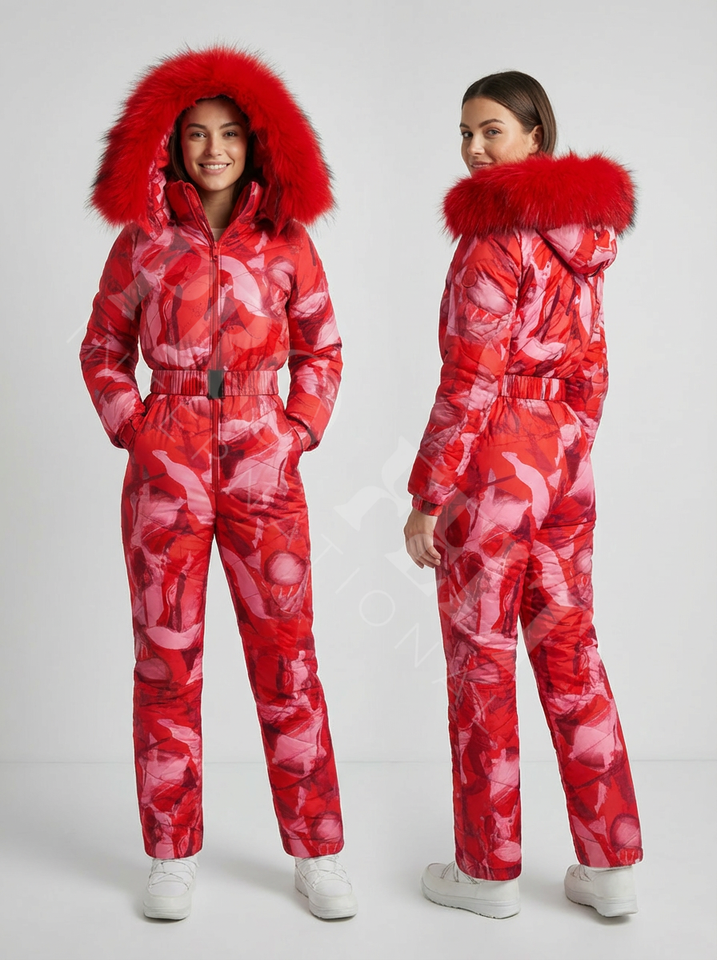 Traje de Nieve Personalizado con Estampado, Traje de una Pieza Acolchado para Invierno con Capucha de Piel, Trajes para Deportes de Nieve, Proveedor OEM ODM