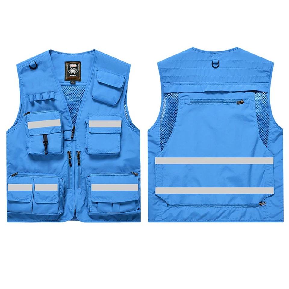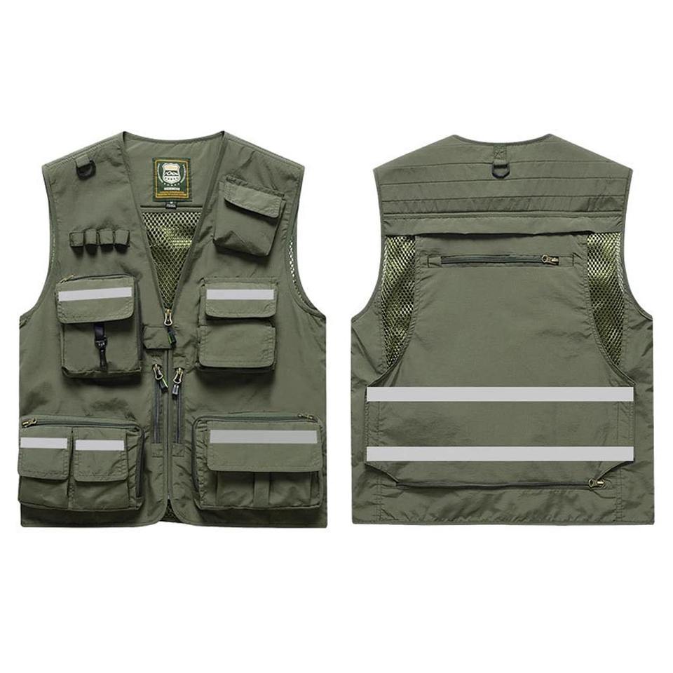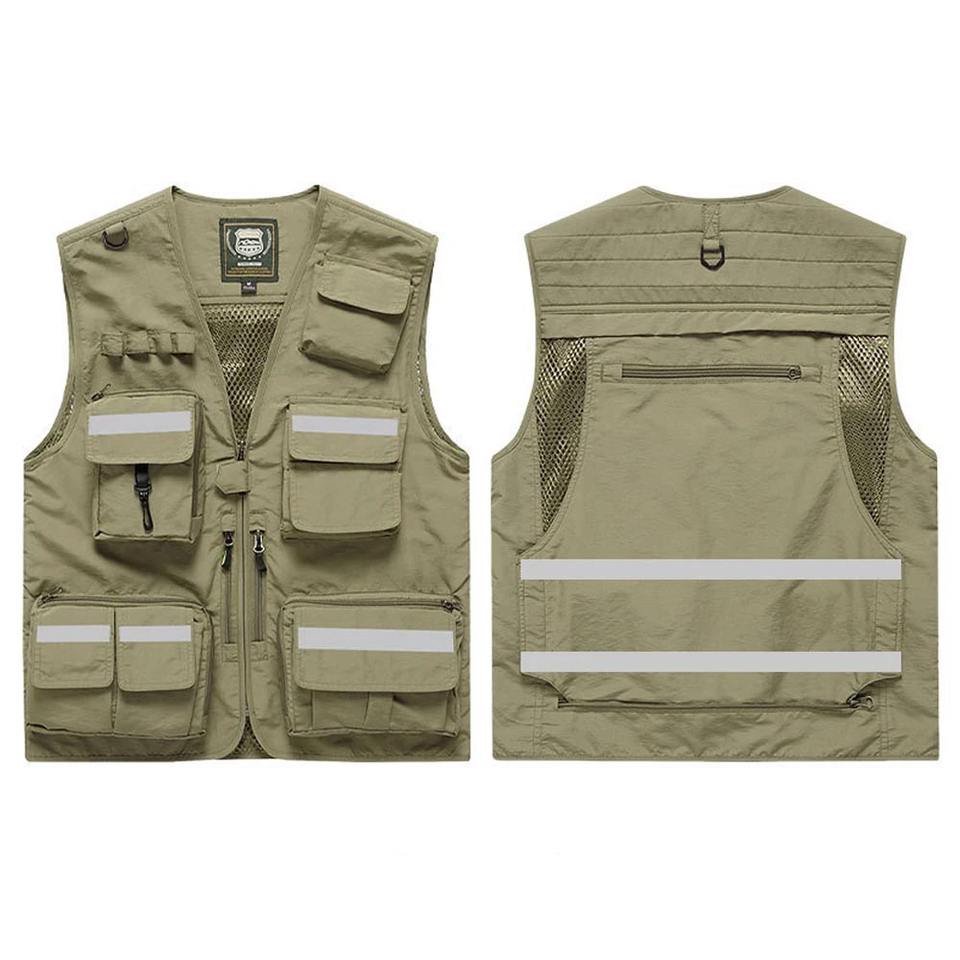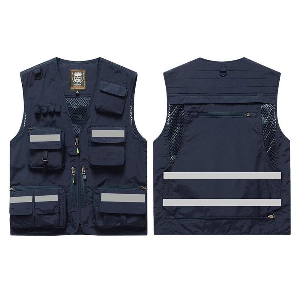 Chaqueta informal de poliéster con logotipo estampado personalizado, cierre de cremallera, cintura multibolsillo, prendas de vestir, ropa de pesca, chaleco de seguridad
