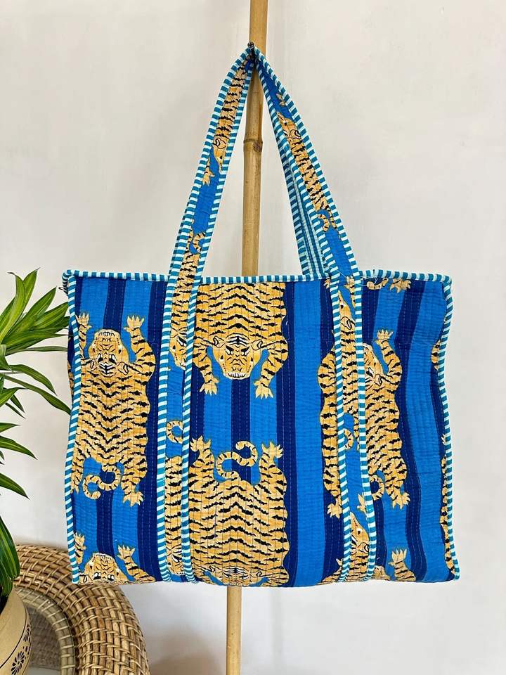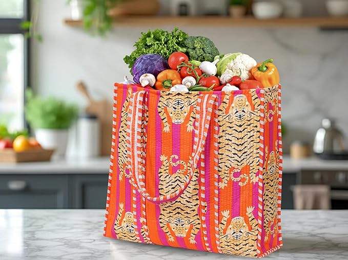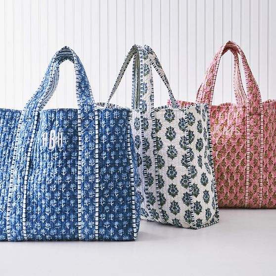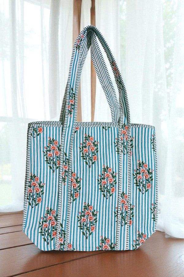 Bolsa de Mano Grande Reversible Personalizada, Acolchada, de Algodón, con Estampado Floral en Rosa, Blanco y Gris