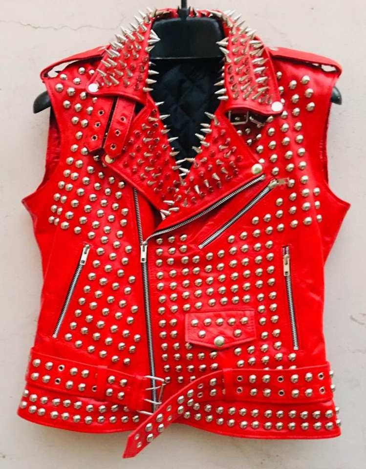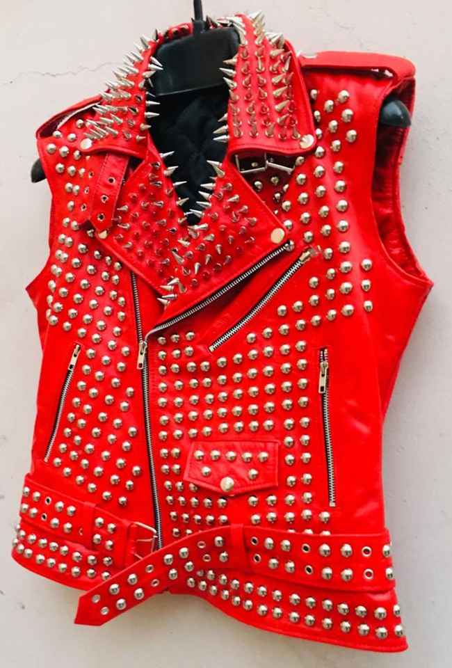 Chaleco de cuero con pinchos rojo personalizado, chaqueta de motorista de estilo Rock con tachuelas pesadas, temporada de invierno, último proveedor de Chaleco de cuero