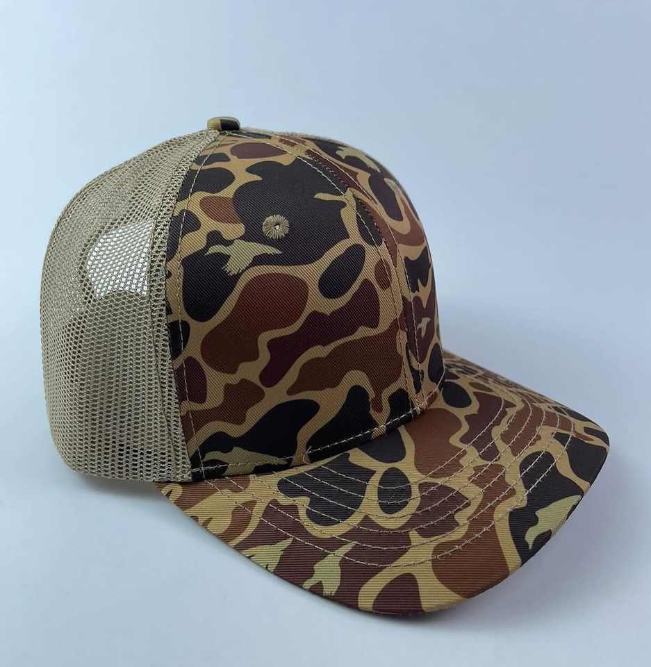 Sombrero de camionero de pato retro personalizado Sombrero de camionero de malla marrón en blanco 6 paneles Gorras de algodón Gorra de camionero con logotipo bordado 3D Camo