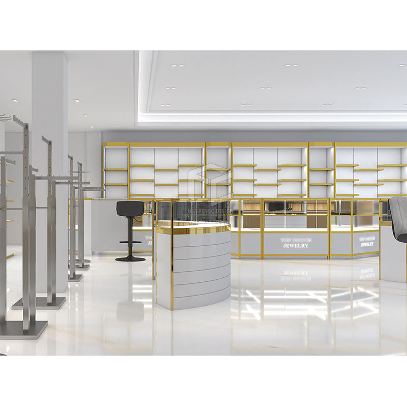 Escaparate de exhibición minorista de luz LED dorada de diseño simple personalizado con servicio ODM OEM y diseño rápido para joyerías