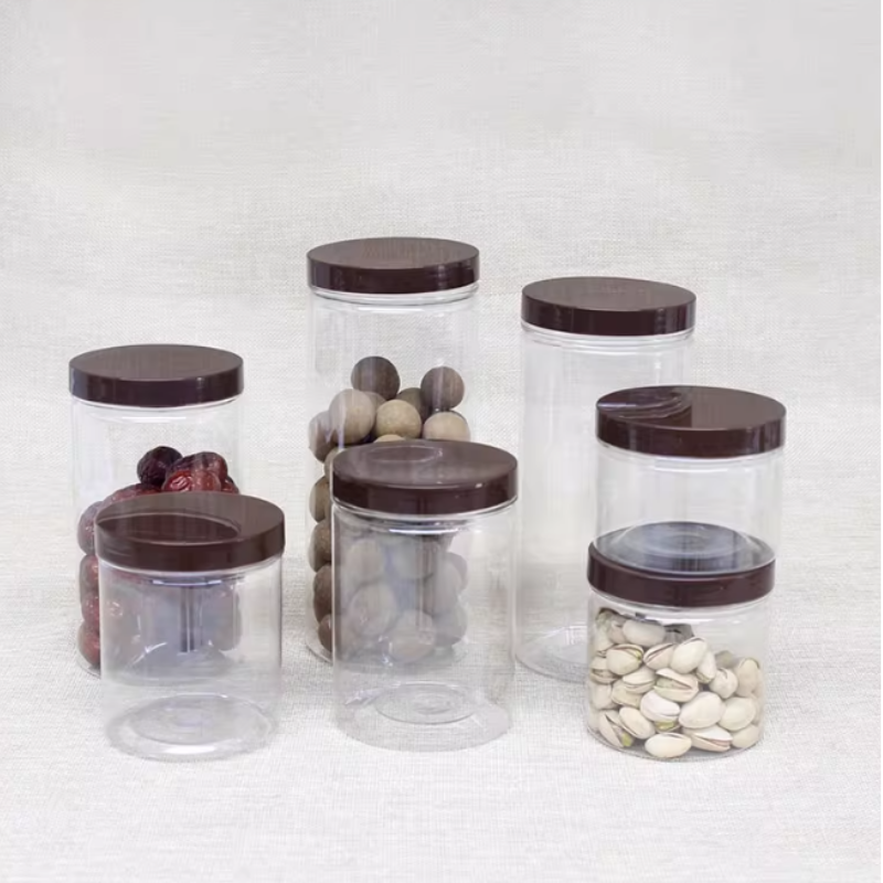 Tarros cilíndricos de plástico PET de tamaño personalizado buenos para tarros de comida con almacenamiento de tapa marrón para envases de granos y polvos