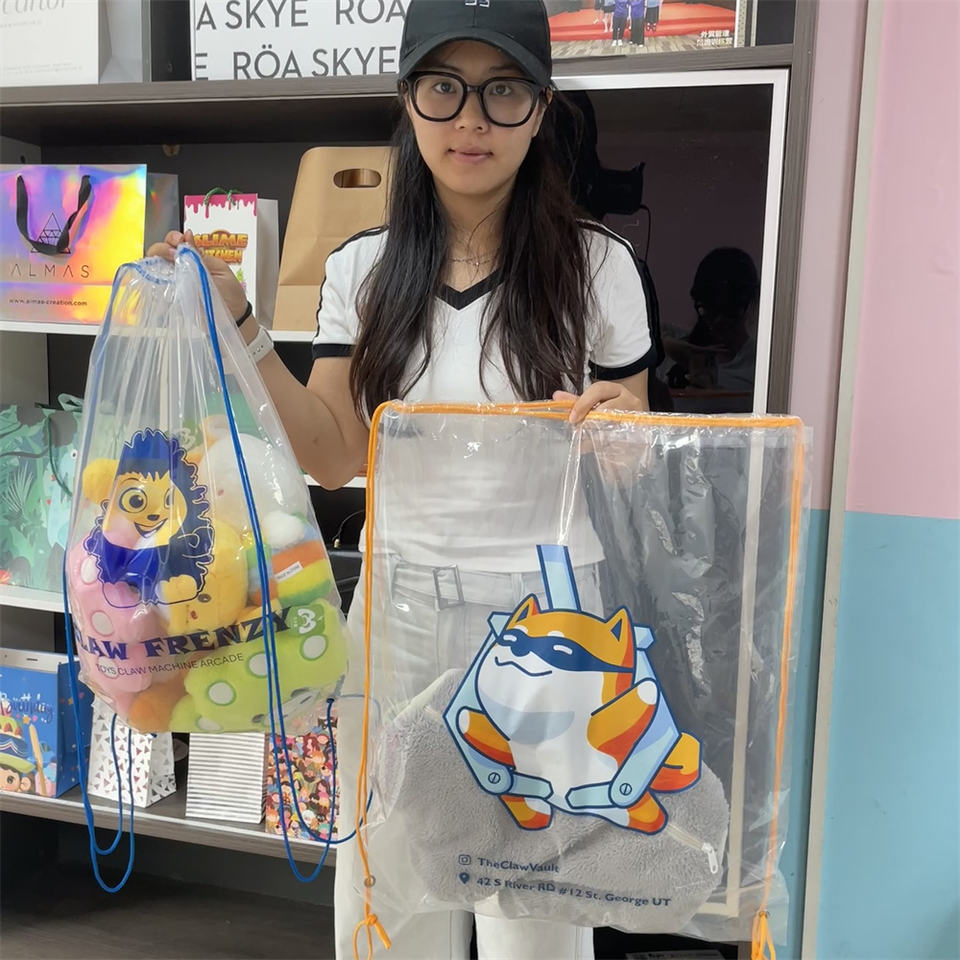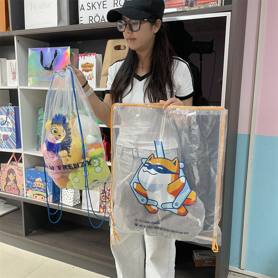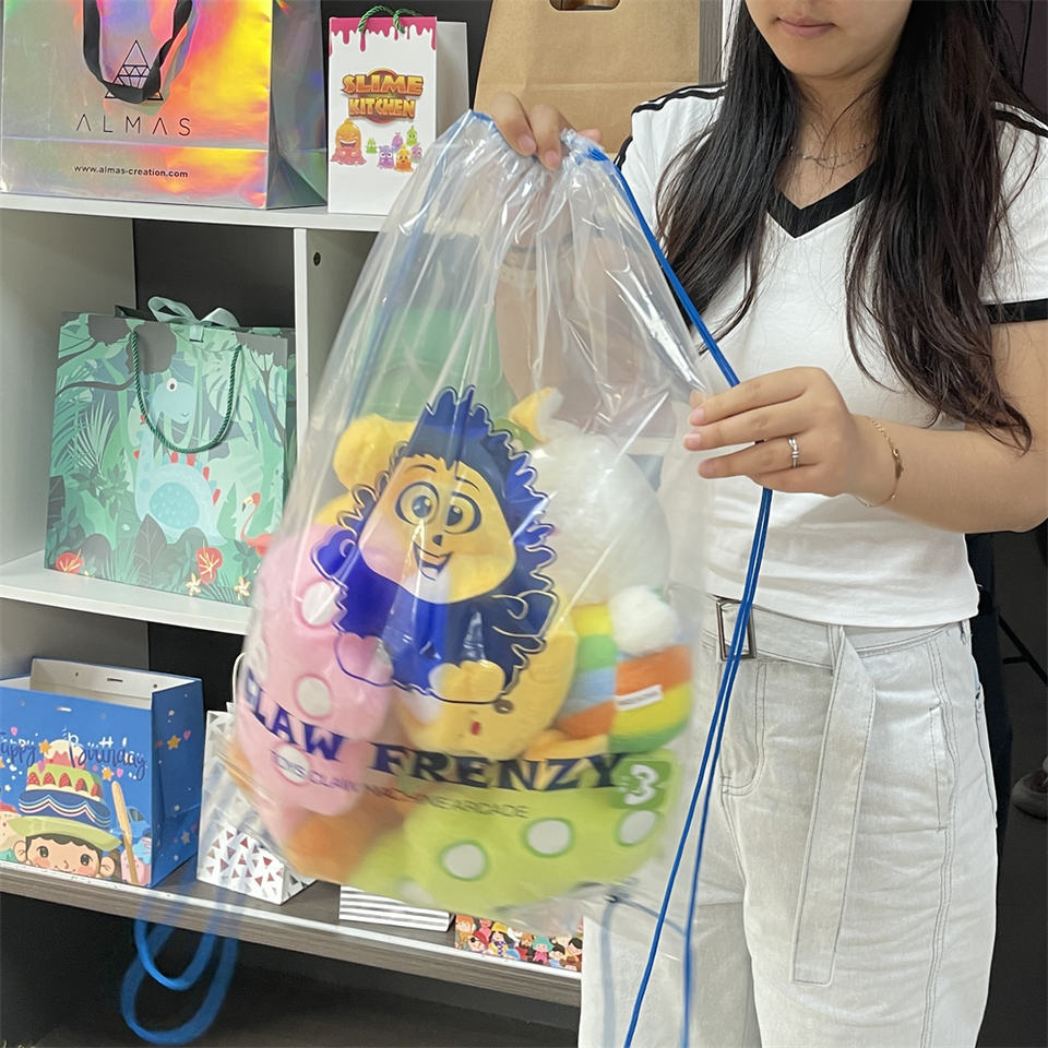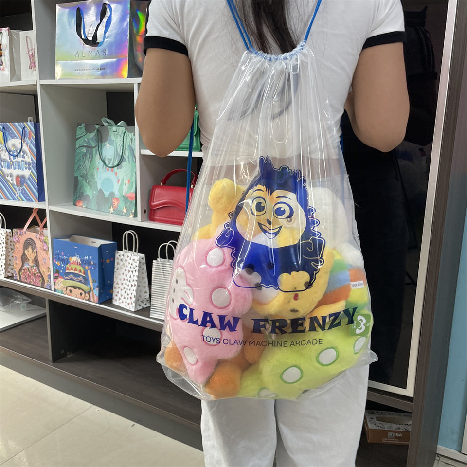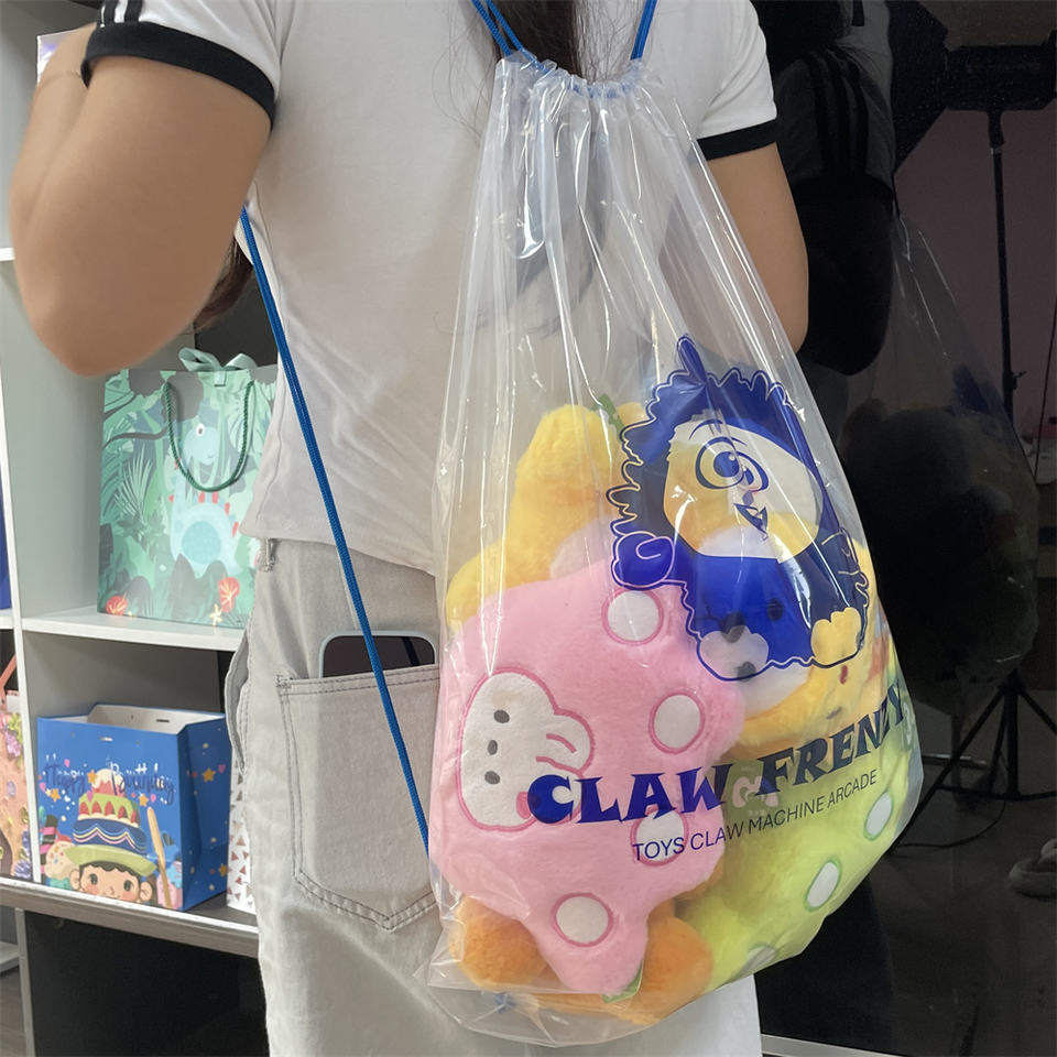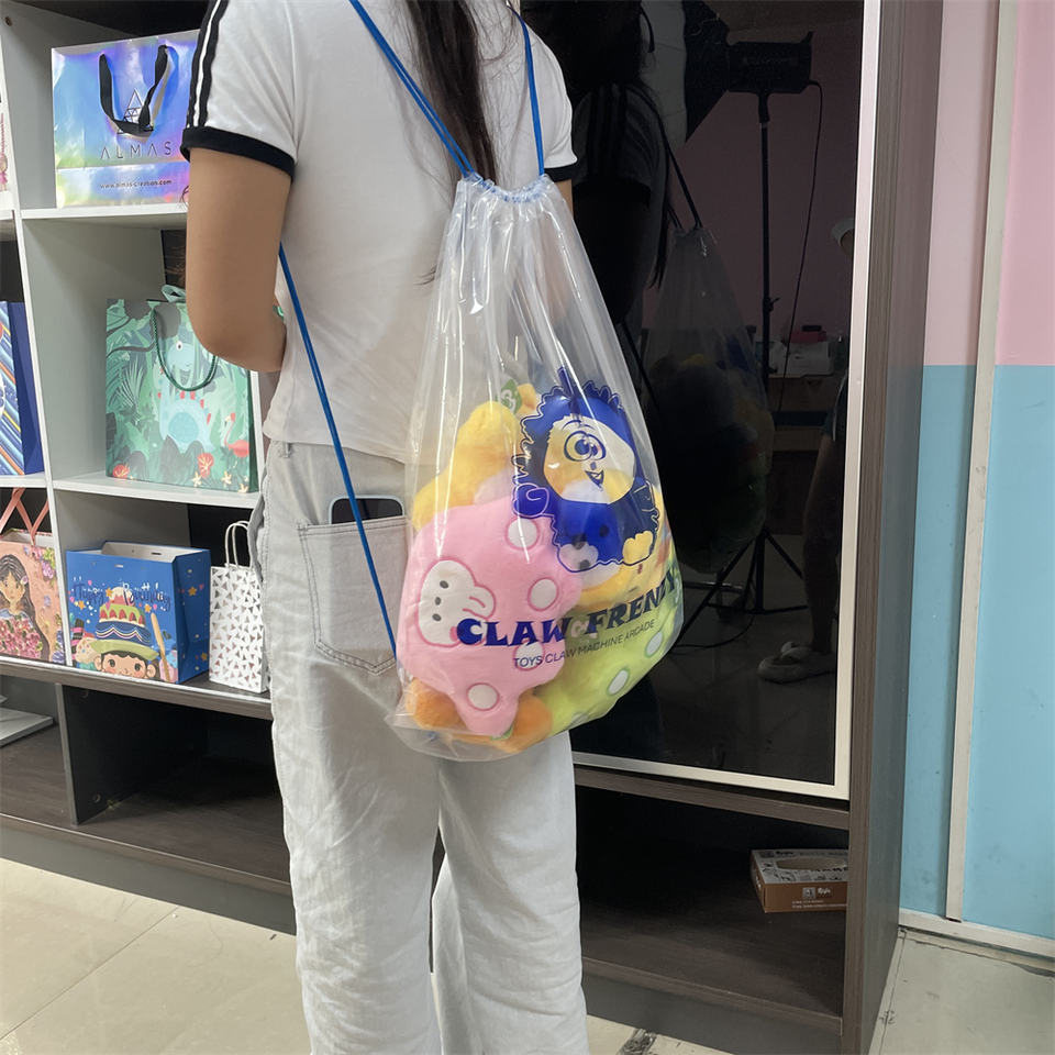 Juguetes de peluche personalizados Mochila con cordón de plástico transparente Bolsa de garra con cordón transparente para máquinas de muñecas